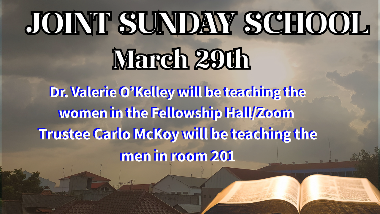 Joint Sunday School Dr. Valerie O’kelley (Women) Trustee Carlo McKoy (Men) Mar 19 Written By Paula Moore Paula Moore